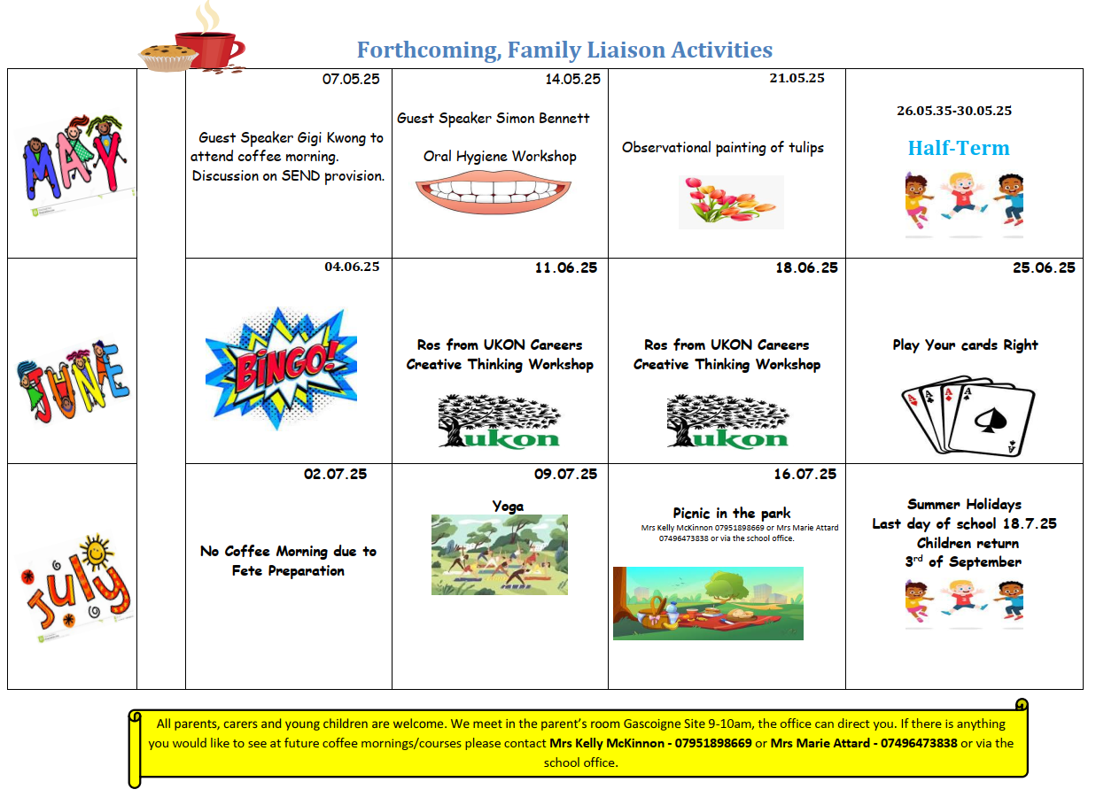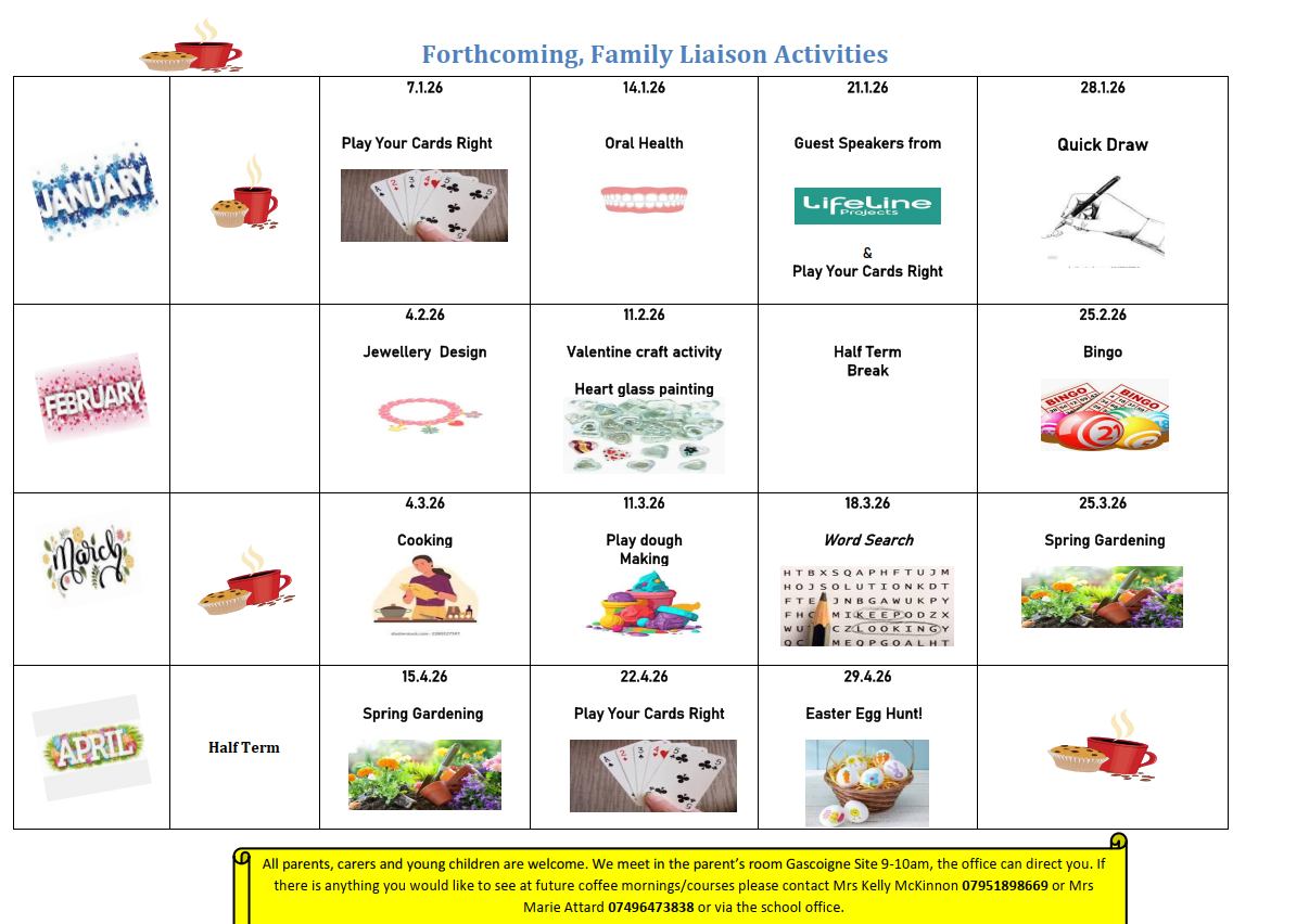 Every Wednesday morning from 9:00-10:00 a.m. in our Family Liaison room on the Gascoigne Road site we have our coffee morning. This is a great opportunity to come and meet new friends and learn new skills.